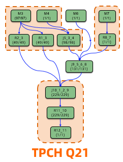 在上图的TPCH Q21上。比如在Q21上,我们看到了通过将作业被切分为三个"bubble",数据能够有效的在节点之间pipeline起来,并且通过热点节点实现调度的加速。最终消耗的资源数(cpu * time) 是准实时作业的35%, 而性能则与一体化调度的准实时作业非常相近(96%), 比离线作业性能提升70%左右。