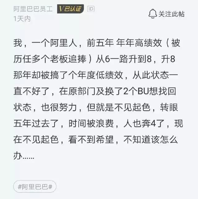 如上就是这名阿里员工的感慨兼吐槽,其如此写道:前五年年年高绩效,被历任多个老板追捧,从6一路升到8,升8那年却搞了个年度低绩效,从此状态一直不好了,在原部门及换了2个BU想找回状态,也很努力,但就是不见起色,转眼五年过去了,时间被浪费,人也奔四了,现在不见起色,看不到希望,不知道该怎么办。