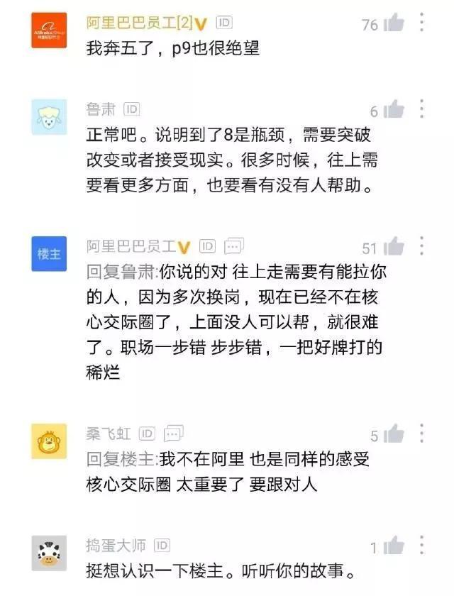 看到这样的吐槽帖,不少同行都纷纷表达了自己的看法,其中不乏阿里系的员工,有网友表示正常,这么高级别再往上爬也不容易:正常吧,说明到了8是瓶颈,需要突破改变或者接受现实,很多时候,往上需要看更多方面,也要看有没有人帮助。
