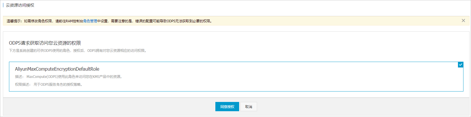 5.在请进行ODPS服务账号授权对话框,单击授权。