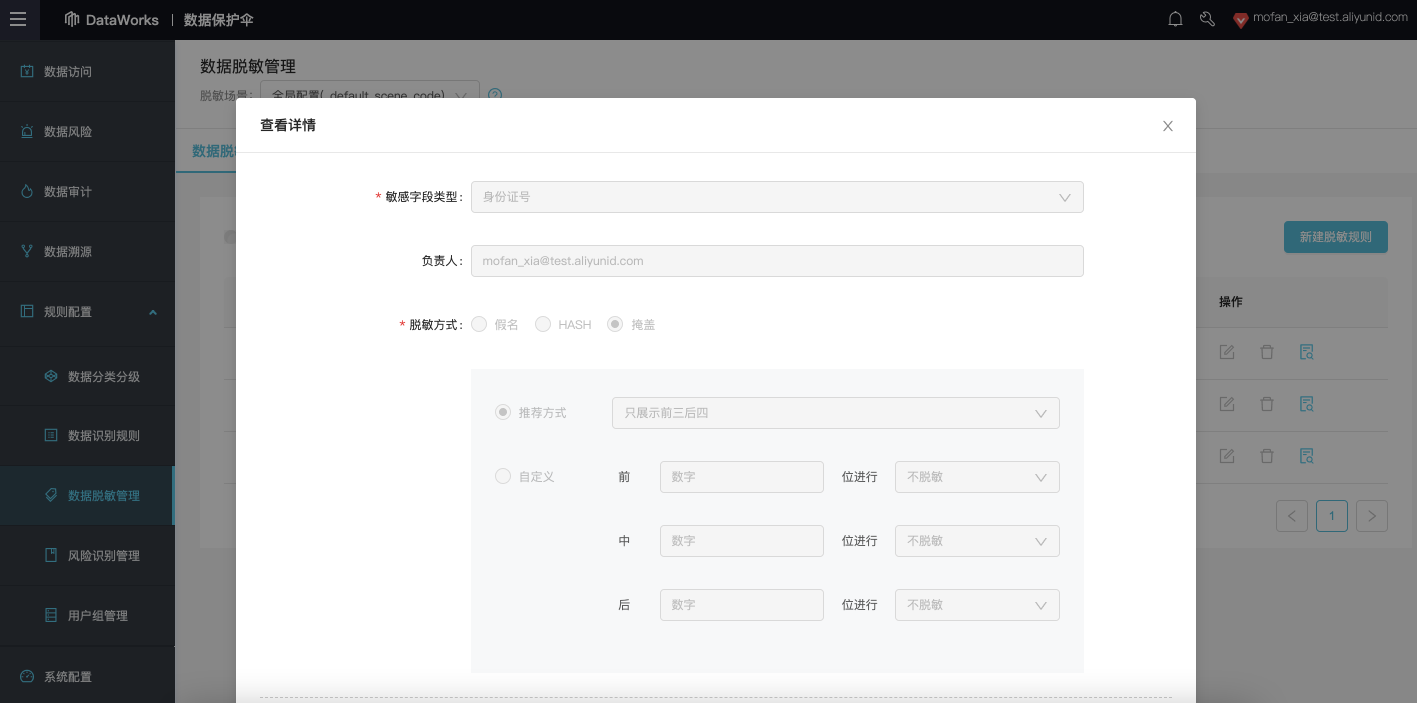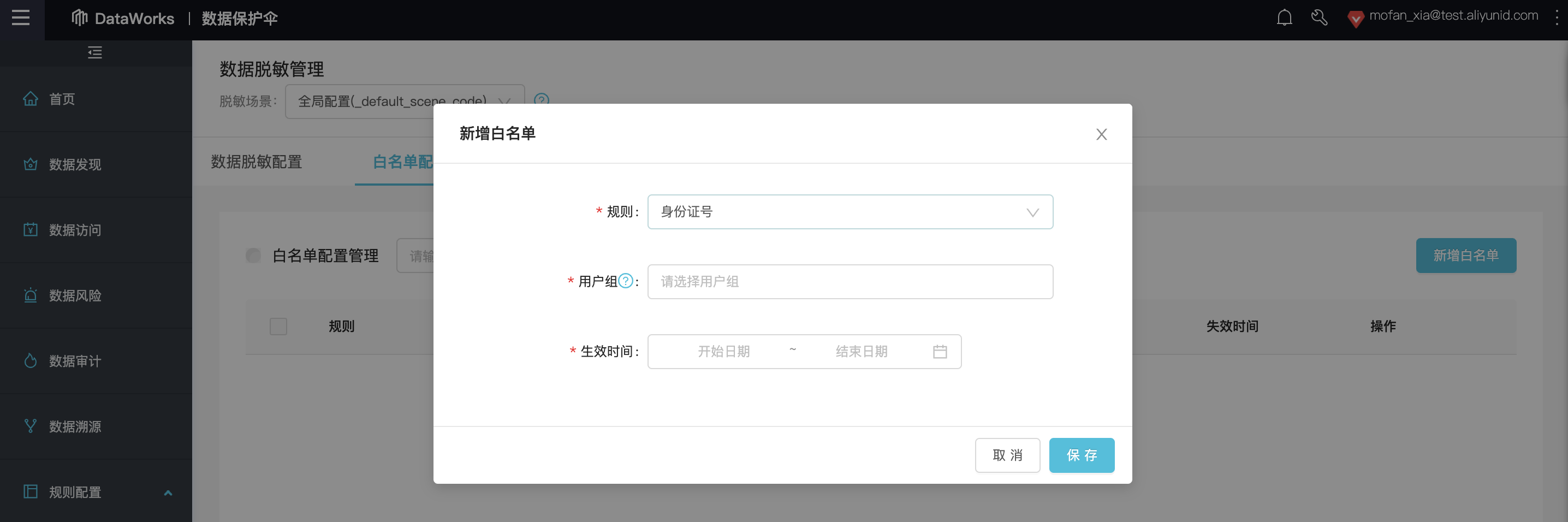 目前数据保护伞对于数据脱敏部分,支持给用户添加白名单,如果在白名单里的客户,可以无视脱敏规则,可以查到明文数据。