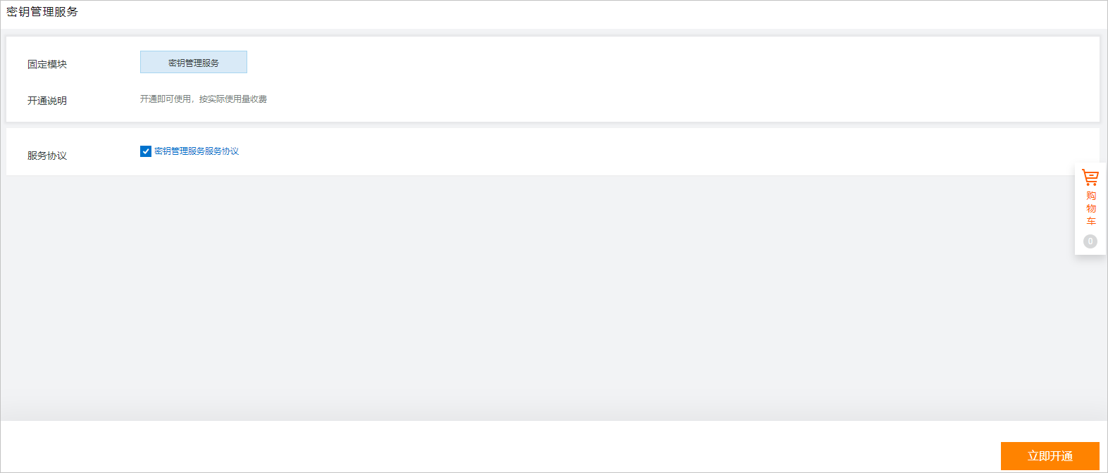- 进入密钥管理服务开通页,选中密钥管理服务服务协议,单击立即开通,开通KMS服务。