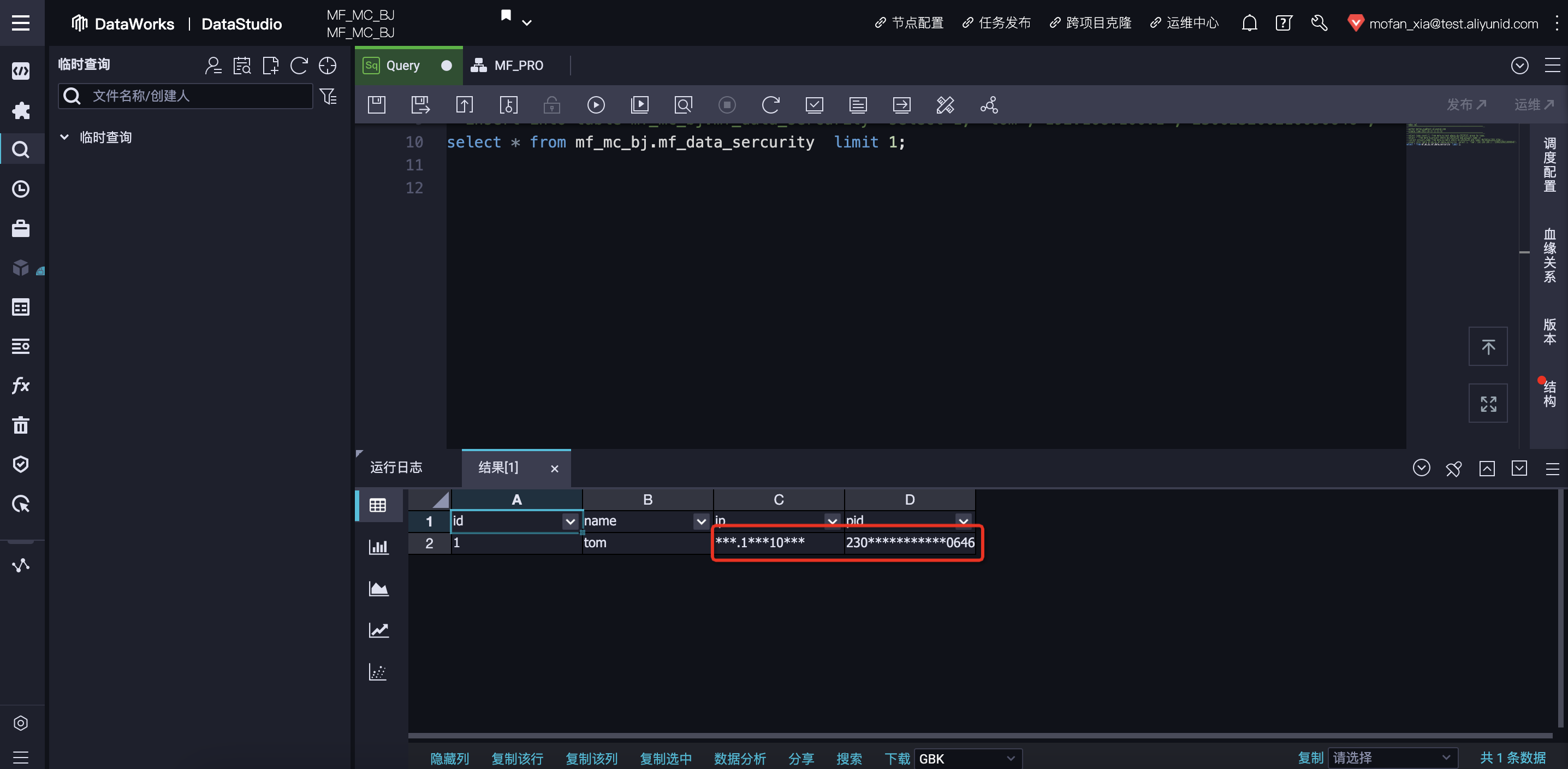 答:先要在Dataworks的设置中开启页面查询内容脱敏。
