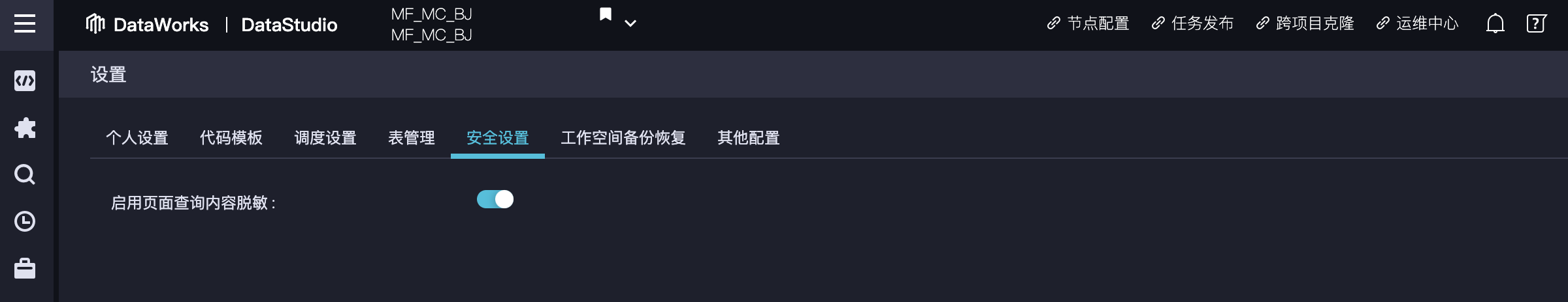 - 登录DataWorks控制台,进入设置,启用页面查询内容脱敏: