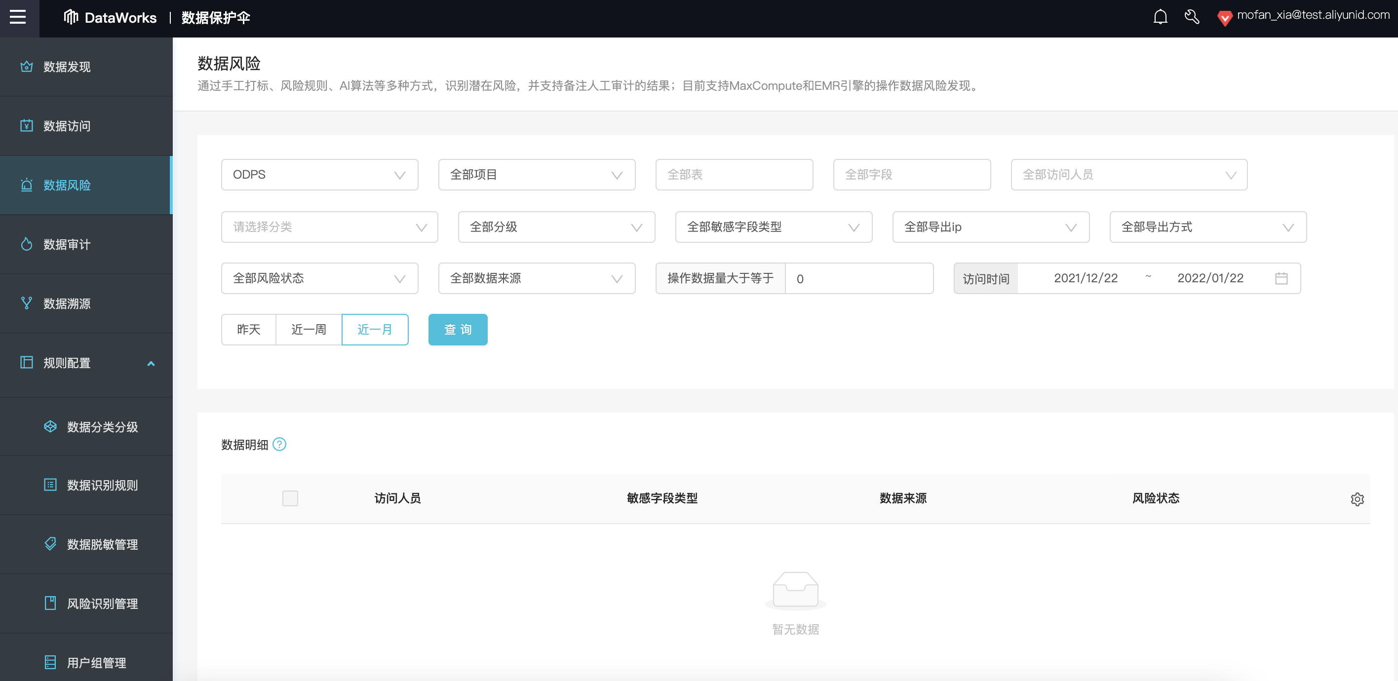目前数据保护伞对于数据脱敏部分,支持用户自定义风险行为,并对风险进行统一查询显示。