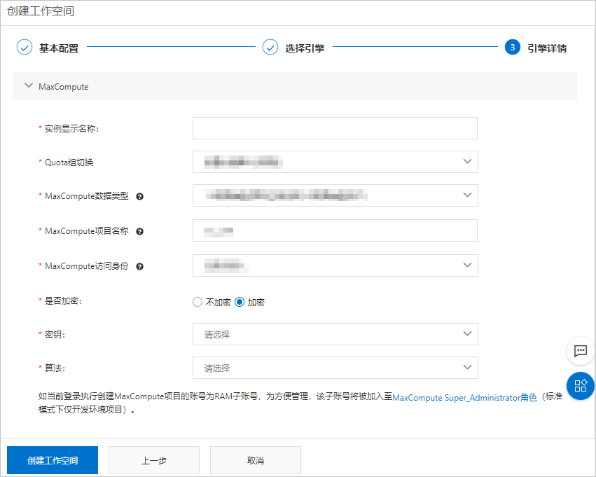 9.单击创建工作空间,完成创建。开启数据加密功能后,MaxCompute会自动完成项目数据读写过程中的加密或解密操作。