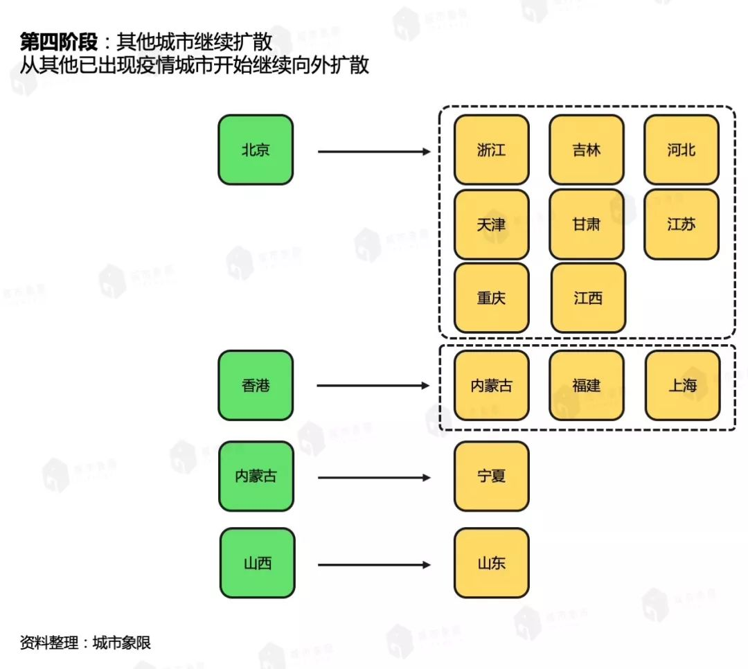 4)第四阶段,人际传播,通过其他城市的感染者扩散到更多省市地区:
