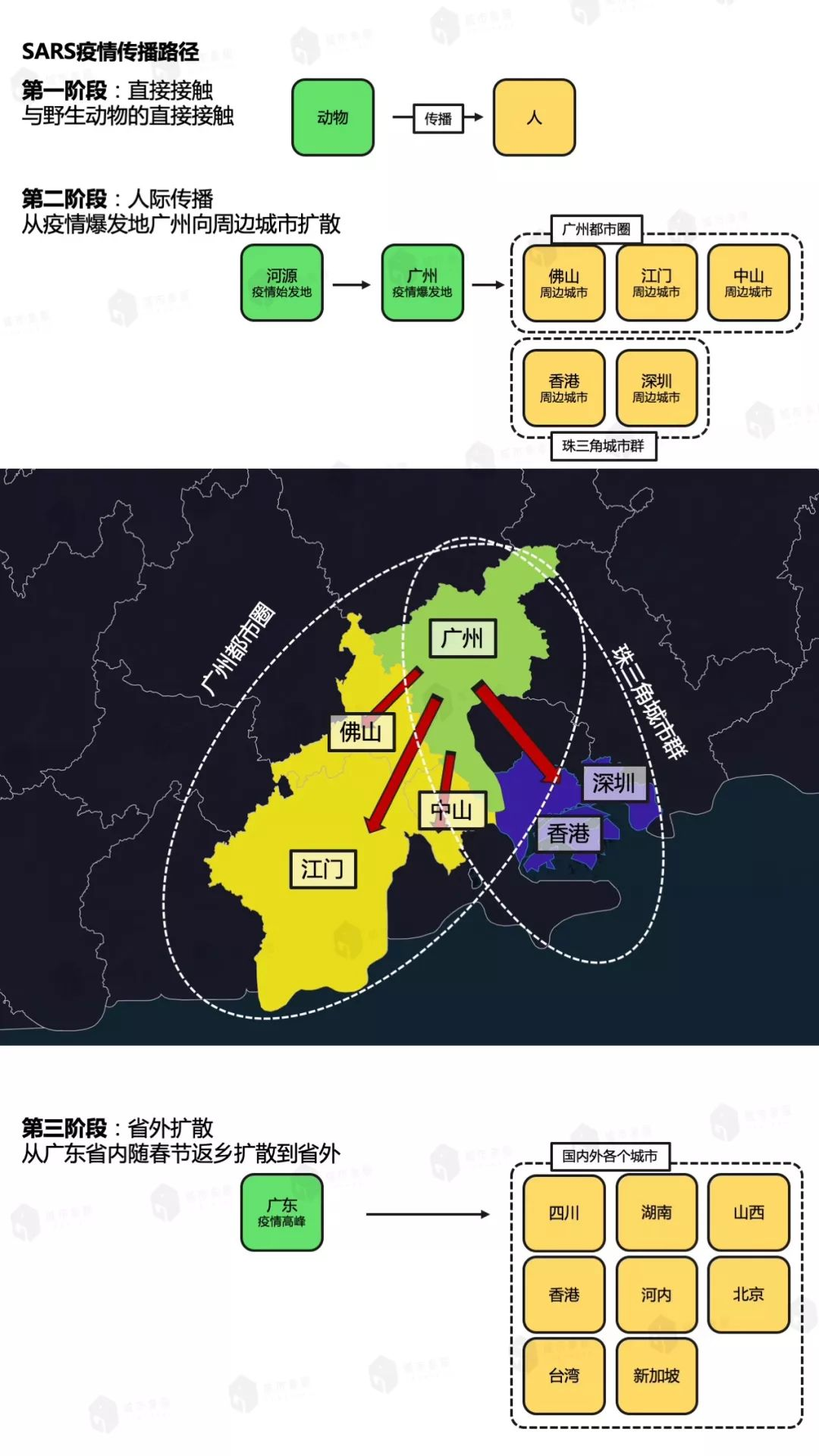 由于此次疫情的“新型冠状病毒”与SARS存在一定的相似性,疫情的源头目前也指向野生动物市场,所以基于对于目前公布的信息,我们对比SARS四个阶段的传播路径: