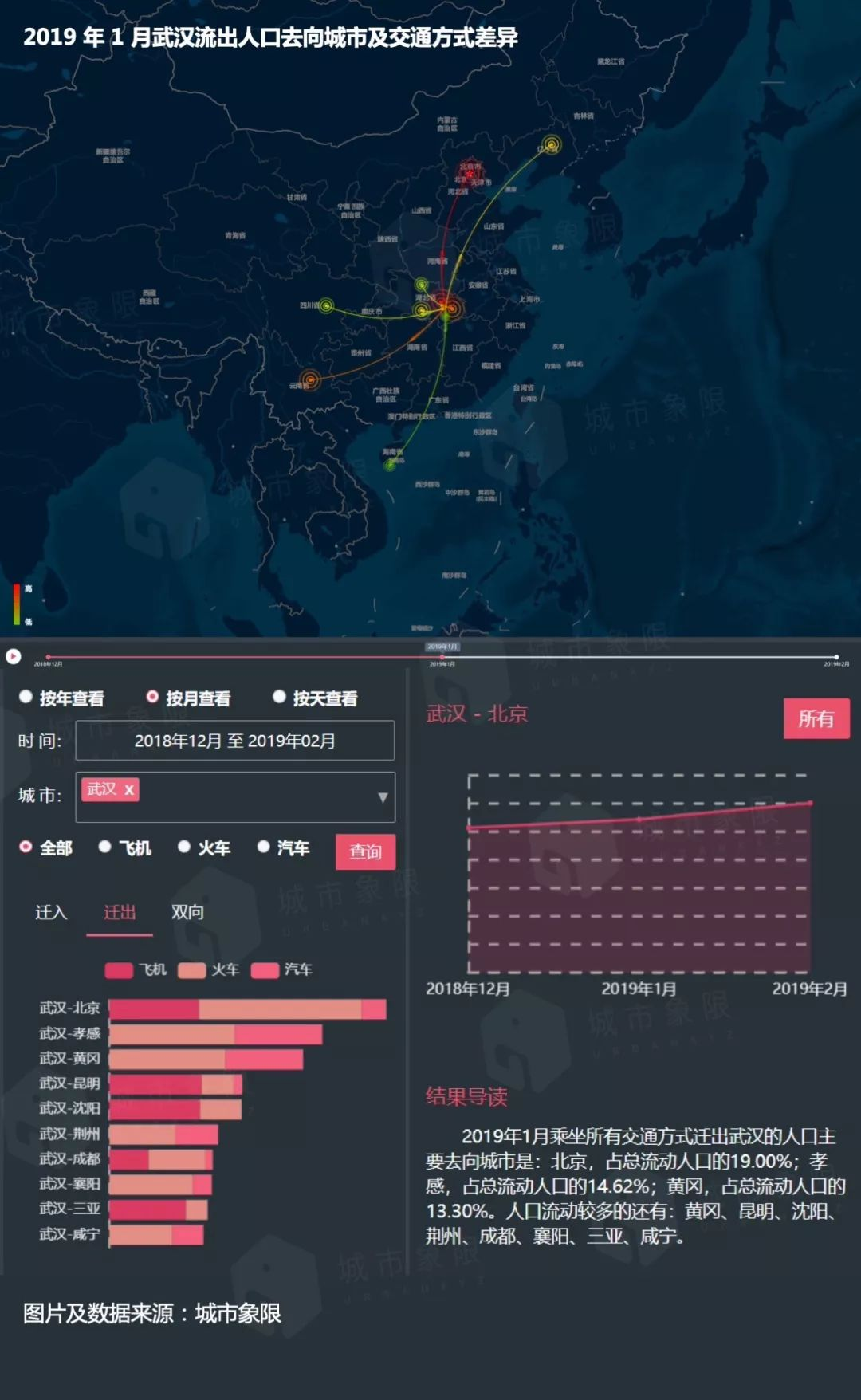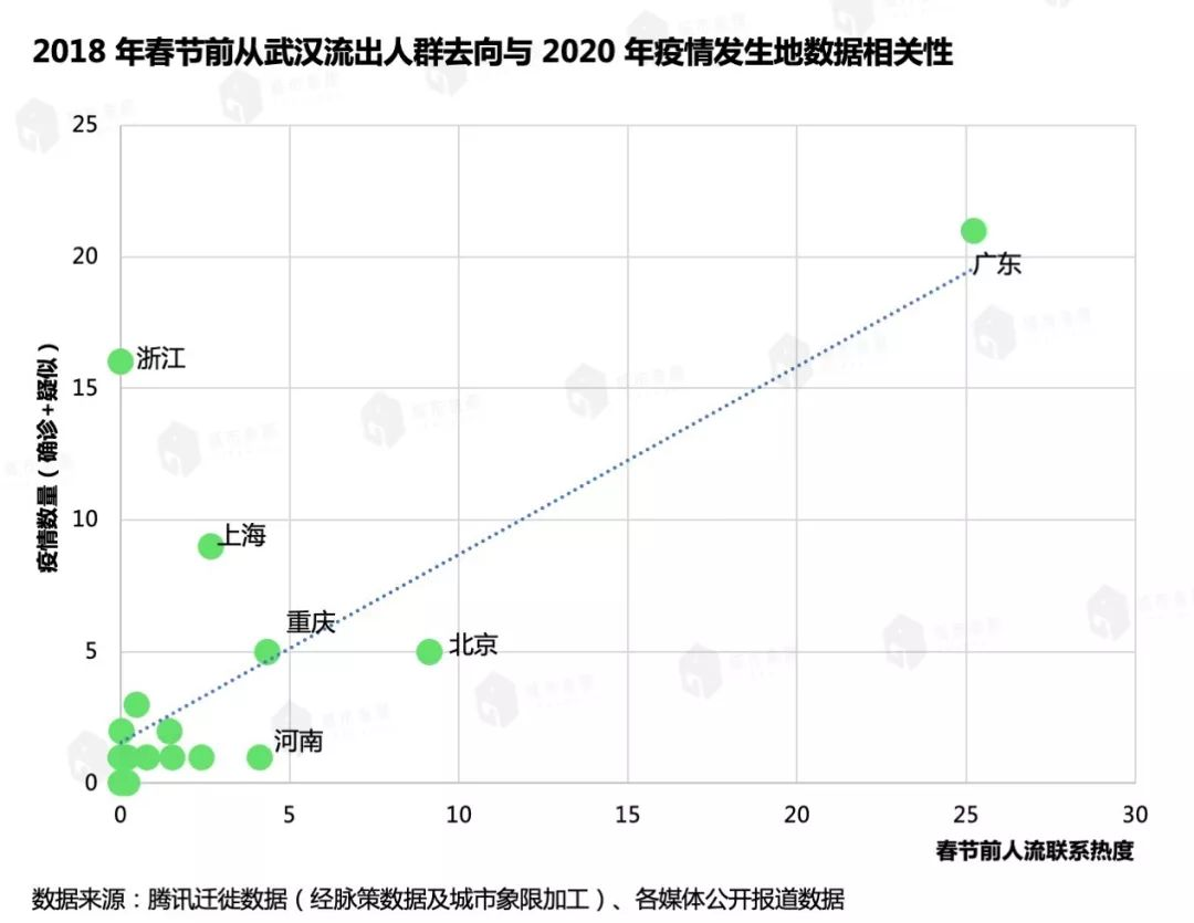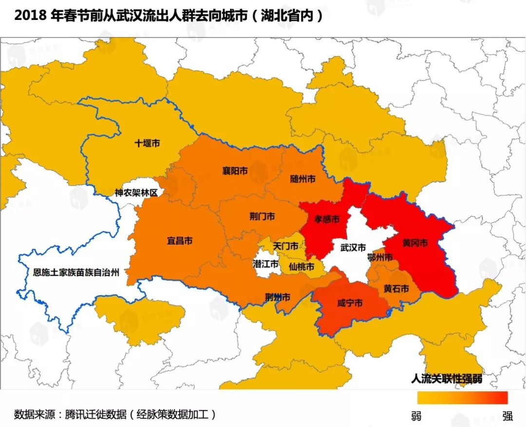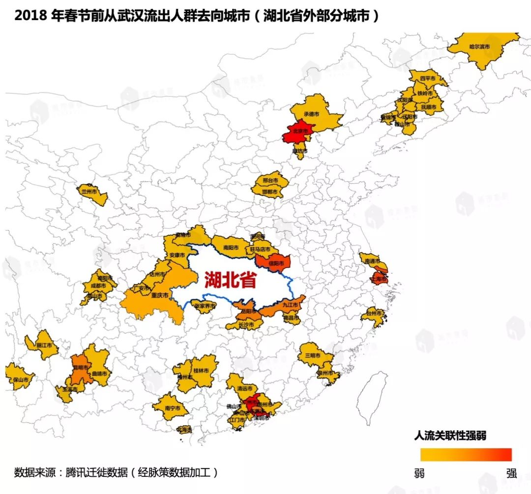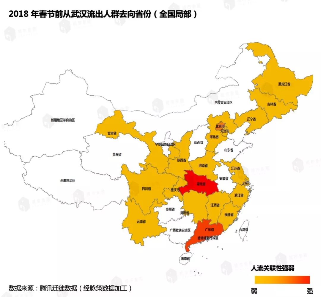 《腾讯迁徙》:其中武汉2018 年春节前去往各城市人流校正数据来自于脉策数据团队对腾讯迁徙数据的加工处理;各城市与武汉人流关联强度数据与疫情发生地相关性来自于城市象限团队对腾讯迁徙数据的加工处理。