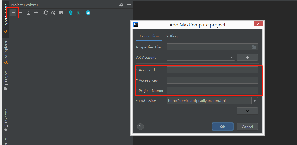 5、单击左上角的+,选择Add project from accessId/Key,添加一个MaxCompute Project