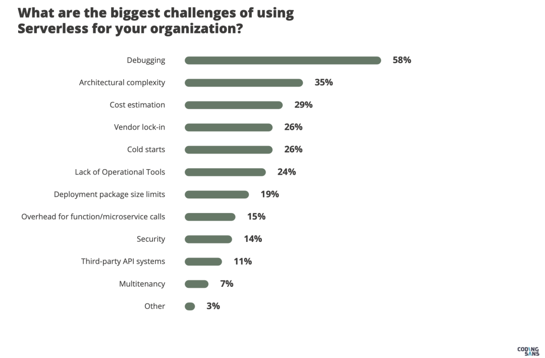 目前最大的难题是调试,这主要是由 Serverless 的架构复杂性所引起的。而供应商之间的巨大差异也使得更换或者说迁移供应商变得非常得不偿失。