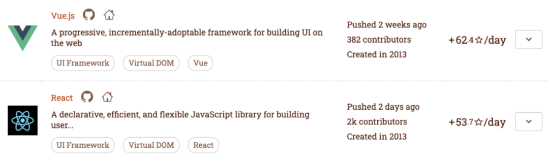在 Github2020 年的新增 Stars 数量上,Vue.js 依旧超过了 React: