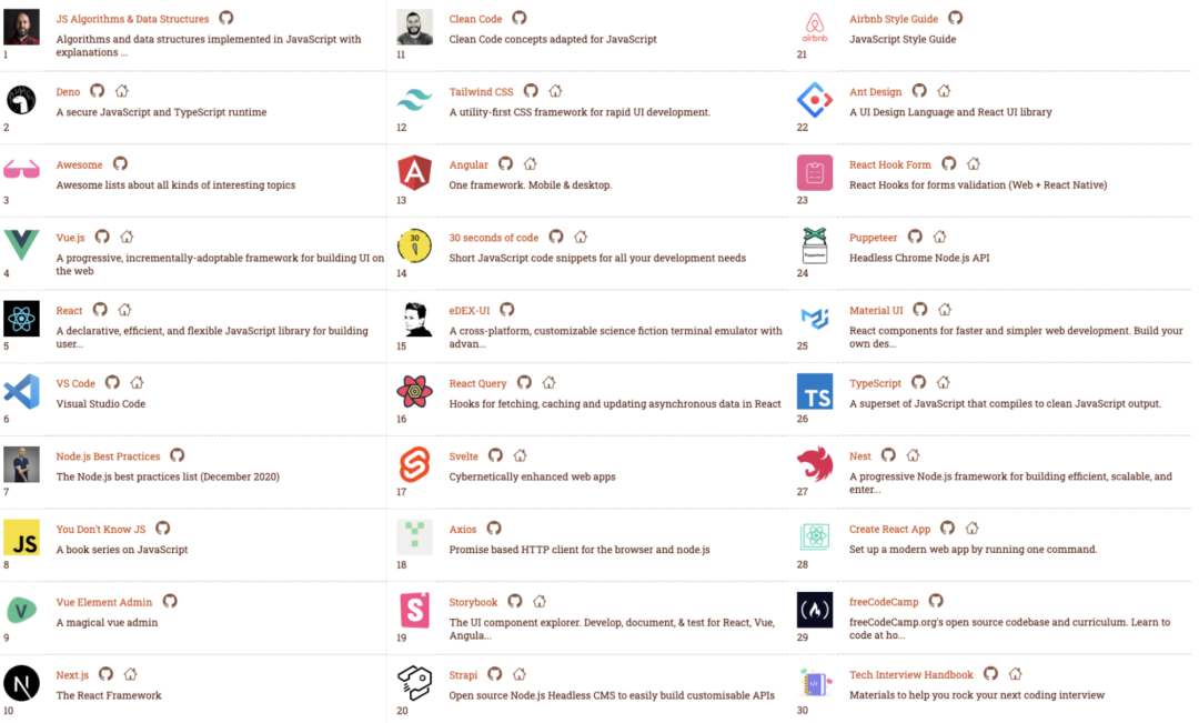 开源站点 bestofjs.org 收录了 Github 上 1500 个开源项目,并且还基于 GithubTrending API 的公开数据,更新统计这些项目的 Stars 新增趋势。基于 Bestofjs 去年的2019 年 JavaScript 明星项目报告和近一年Trending 排行数据,下面展示了 Top30 的前端重点项目,并对此进行简单的介绍。