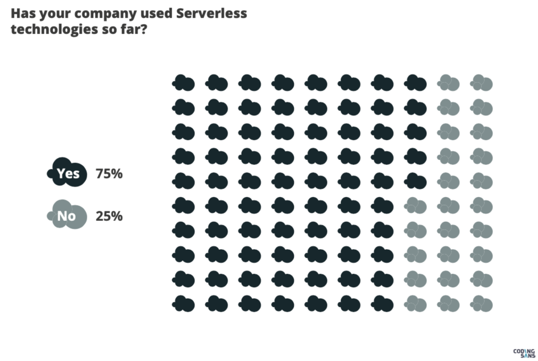 今年 9 月 CodingSans 联合其 9 个合作伙伴,发布了 Serverless2020 年度状态报告。调查结果显示:有 75%的开发者会在公司使用这项技术。如此高的 Yes 也基本反映出了这样的技术已经被大众普遍接受并使用。