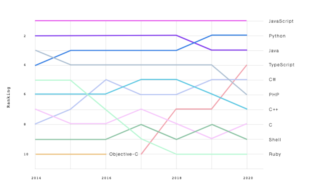 从 2019 年开始,社区内掀起了学习使用 TypeScript 的浪潮,从 npm 的下载量来看,近几年 TypeScript 呈现爆发式增长,甚至在 2020 年在 Github 语言的排行榜上跃居到了第四位。