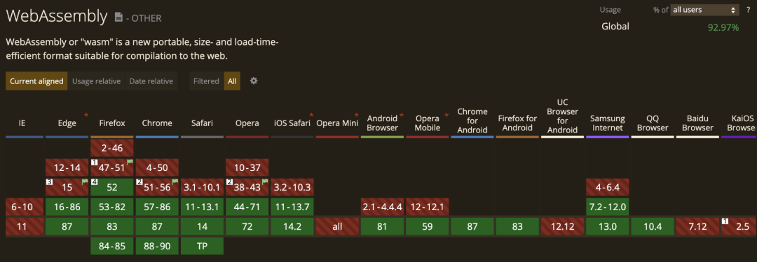 WebAssembly 源于 Mozilla 发起的 Asm.js 项目,也被称为“设计补充 JavaScript”,其本解码速度比 JS 解析快得多,让高性能的 Web 应用在浏览器上运行成为可能。该模块可在浏览器中的专有虚拟机上执行,与 JavaScript 虚拟机共享内存和线程等资源。目前主流浏览器基本都支持了 WebAssembly。