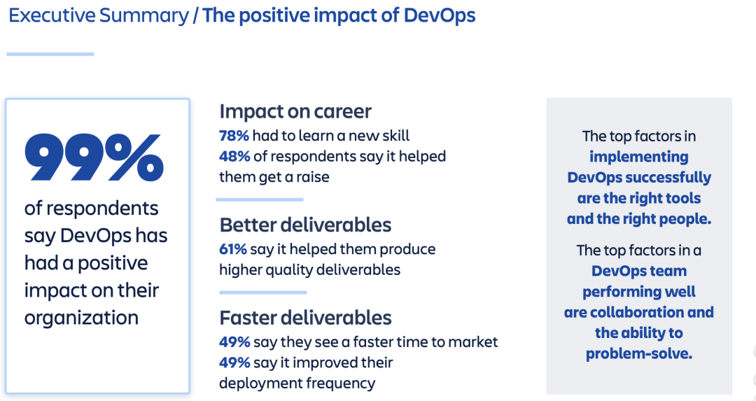在 2020 的 DevOpsSurvey 中,DevOps 带来的正面影响获得了 99%的认可度: