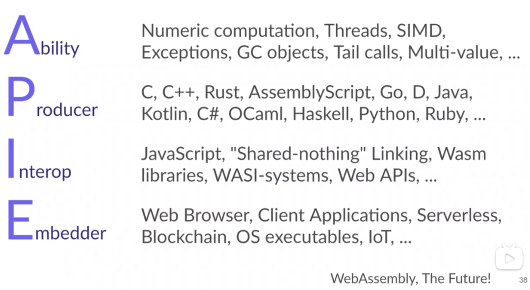 首届 WebAssemblySubmmit 2020 年在硅谷举行,会议上讨论了诸如:关于构建 WebAssembly 新型生态系统,WebAssembly 的未来以及 WebAssembly 与诸如 Javascript 等其他支持技术的关系;WebKit 的 WebAssembly 实现的编译、启动和运行时等 benching 领域进行的研究和开发;其中 Ben 演讲的“Expandingthe PIE” 。
