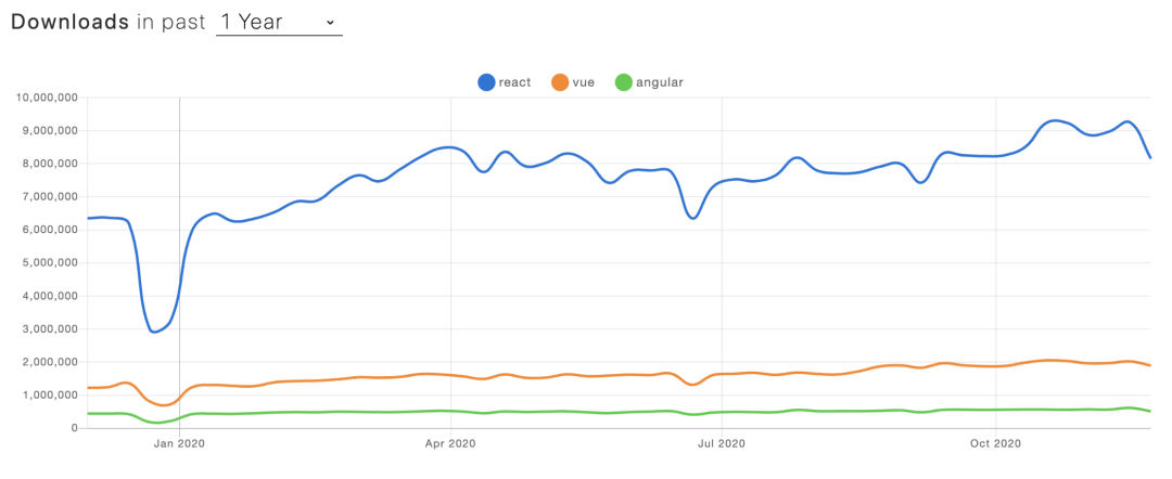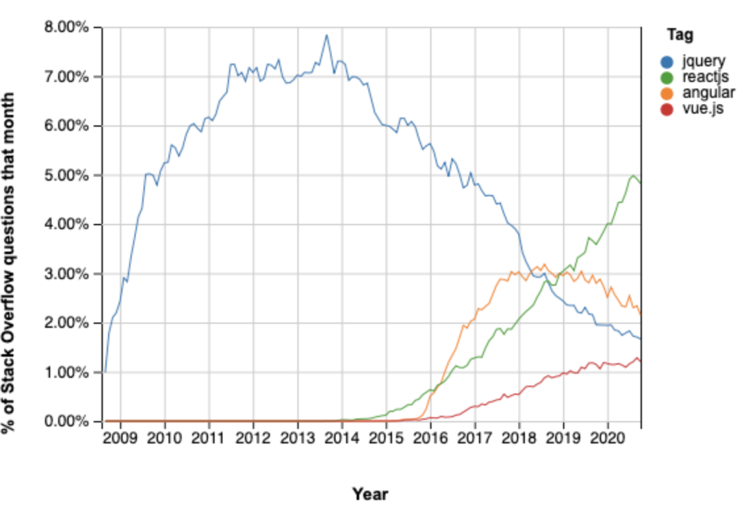 2020 年的 StackOverflow Trends 显示 React> Vue.js > Angular;