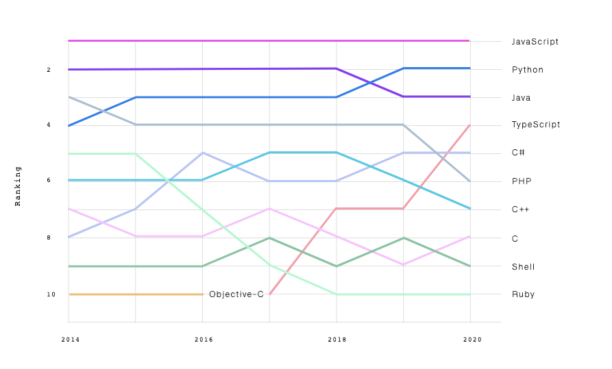 从 2019 年开始,社区内掀起了学习使用 TypeScript 的浪潮,从 npm 的下载量来看,近几年 TypeScript 呈现爆发式增长,甚至在 2020 年在 Github 语言的排行榜上跃居到了第四位。