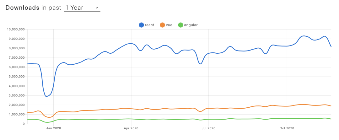 2020 年的 StackOverflow Trends 显示 React> Vue.js > Angular;