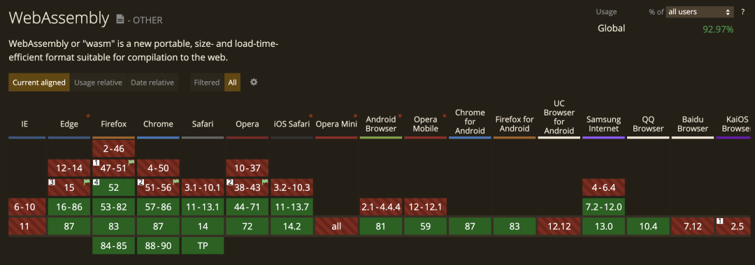 WebAssembly 源于 Mozilla 发起的 Asm.js 项目,也被称为“设计补充 JavaScript”,其本解码速度比 JS 解析快得多,让高性能的 Web 应用在浏览器上运行成为可能。该模块可在浏览器中的专有虚拟机上执行,与 JavaScript 虚拟机共享内存和线程等资源。目前主流浏览器基本都支持了 WebAssembly。