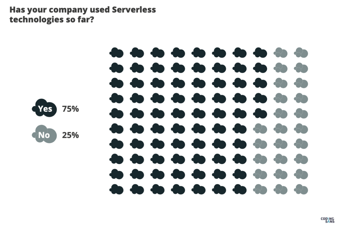 今年 9 月 CodingSans 联合其 9 个合作伙伴,发布了 Serverless2020 年度状态报告。调查结果显示:有 75% 的开发者会在公司使用这项技术。如此高的 Yes 也基本反映出了这样的技术已经被大众普遍接受并使用。