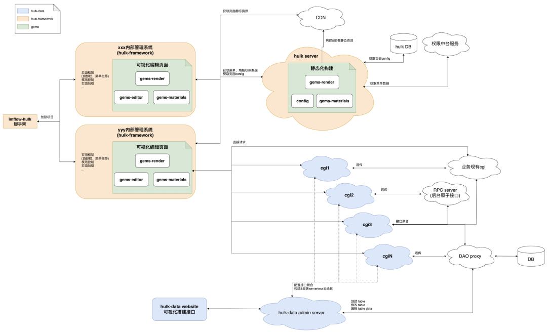 与此同时,在 Vision 系统的基础上,我们沉淀出一套可视化搭建引擎 Gems,针对日渐增加的 B 侧需求,以 Gems 为核心开发了专注于搭建管理系统的平台 Hulk,实现了相对运营页面更为复杂的管理页面甚至数据接口的可视化搭建与生成。
