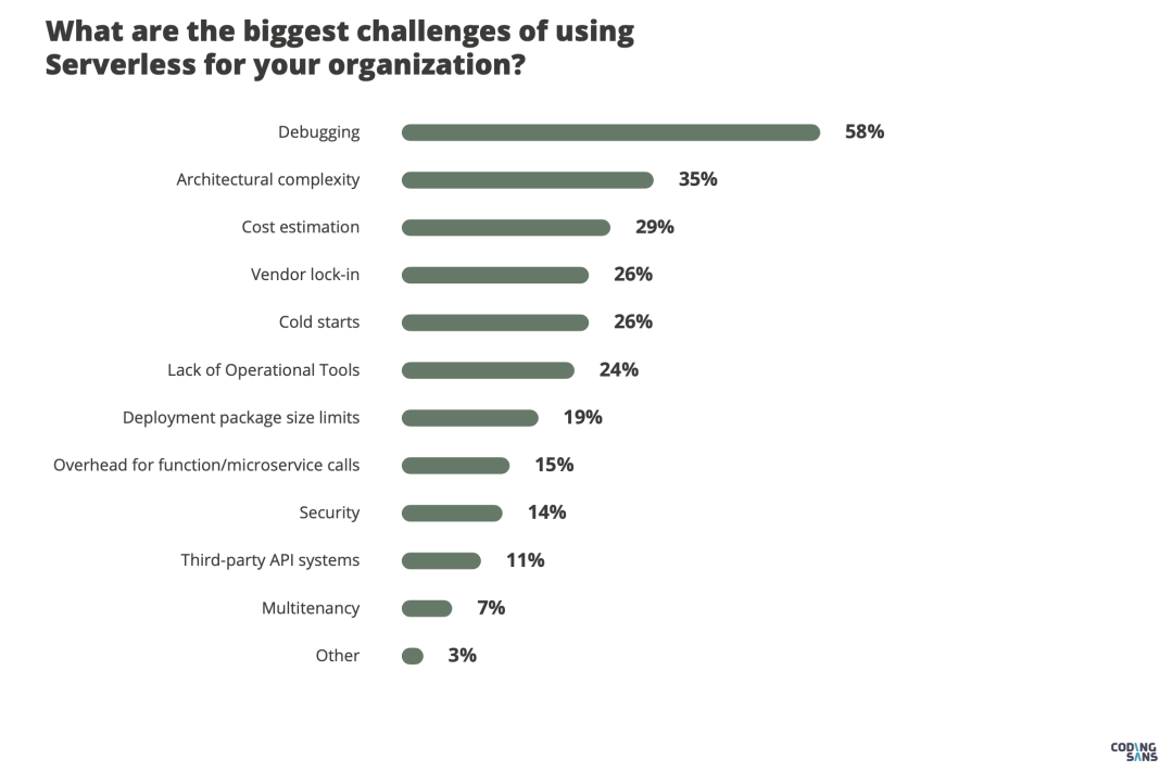 目前最大的难题是调试,这主要是由 Serverless 的架构复杂性所引起的。 而供应商之间的巨大差异也使得更换或者说迁移供应商变得非常得不偿失。