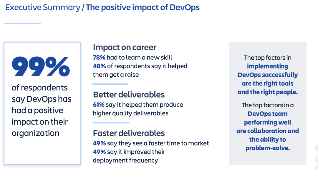 在 2020 的 DevOpsSurvey 中,DevOps 带来的正面影响获得了 99% 的认可度: