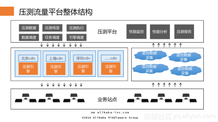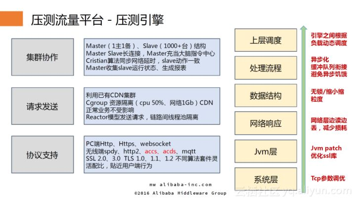 协议支持,主要支持的PC端协议包括Http、Https、websocket,无线端协议是Spdy、http2、accs、acds、mqtt。由于真正在双11时,用户使用的浏览器各异,进而导致与服务端协商的加密算法不一致,为了尽量模拟准确性,需要支持SSL 2.03.0、TLS1.01.11.2不同算法套件灵活配比,贴近用户端行为。