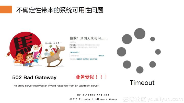 技术架构带来的不确定性,阿里在08年开始对系统进行拆分,由原有的单一系统拆分成了分布式架构,包括CDN、网关、负载均衡、分布式页面系统等,整体的技术生态十分丰富。分布式环境任意环节出了问题都可能会对系统造成影响;