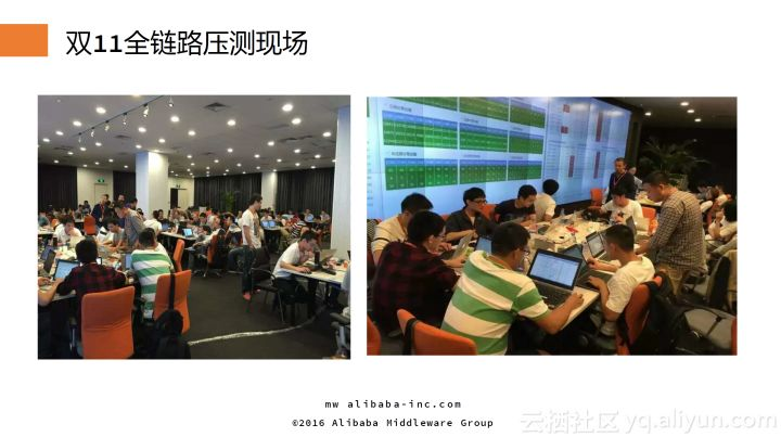 上图是双11全链路压测的现场照片,双11全链路压测阶段除了对系统稳定性进行检测之外,还对团队的人员组织、协作进行了演练、检验,确保双11零点到来时,万事俱备。