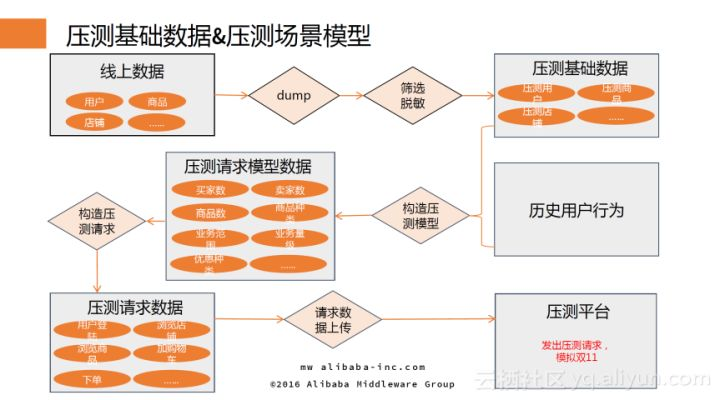 基于用户数据构建压测模型是全链路压测中较为复杂的一步,它要求压测模型贴近双11零点的用户模型。我们根据前几年的历史数据和行为,结合预测算法进行模型的预估;最后生成业务场景模型;这些模型再和各个业务系统的负责人研讨,进行微调。根据最后确定的压测业务模型构造压测请求数据,最后将请求数据上传到压测平台,发出压测请求,模拟双11。