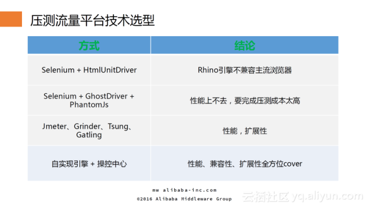 最初做全链路压测时,尝试采用浏览器引擎去做,但由于Rhino引擎不兼容主流浏览器;后来换成了Selenium+ChostDriver+PhantpmJS,这种方式能够真实模拟用户的环境,但性能上不去,要完成压测成本太高;再后来,我们尝试了一些第三方的压测工具如Jmeter、Grinder、Tsung、Gatling等,但由于性能和扩展性方面的原因,被迫放弃;最终,我们采用了自实现引擎和操控中心来进行搭建压测流量平台,实现性能、兼容性、扩展性全方位Cover。