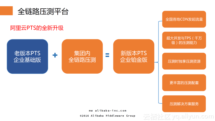 目前,全链路压测与阿里云PTS产品进行了融合,生成新版本PTS(企业铂金版)。该版本包含全链路压测的流量功能,从全国各地CDN发起流量;且具有超大并发与TPS(千万级)的压测能力;在压测时独享压测资源以及更丰富的压测配套;此外,新版本PTS还对外提供压测解决方案服务,满足客户同阿里一样的全链路压测需求。
