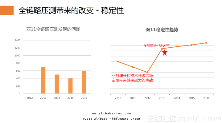 全链路压测给双11带来的最大的改变是稳定性,从13年起,双11零点的稳定性较11、12年得到了大幅提升,这是因为在全链路压测过程中,每年都能发现几百个问题并提前解决,极大地提高了零点的稳定性。
