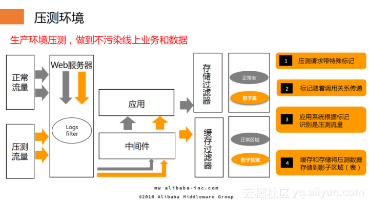 由于是在生产环境做双11的全链路压测模拟,因此防止压测数据和流量污染和干扰生产环境是及其重要的。要实现这一目标,首先要求压测流量能被识别,采用的做法是所有的压测流量都带有特殊的标记,并且这些标记能够随中间件协议的调用关系进行传递;此后,应用系统根据标记识别压测流量;在缓存和存储时,通过存储和缓存过滤器将压测数据存储到影子区域(表)而不是覆盖原有数据。上述所有操作都遵循一个原则:能够用中间件解决的问题,绝不对业务系统进行改造,系统所需做的是升级中间件,这一原则极大提高了工作效率。
