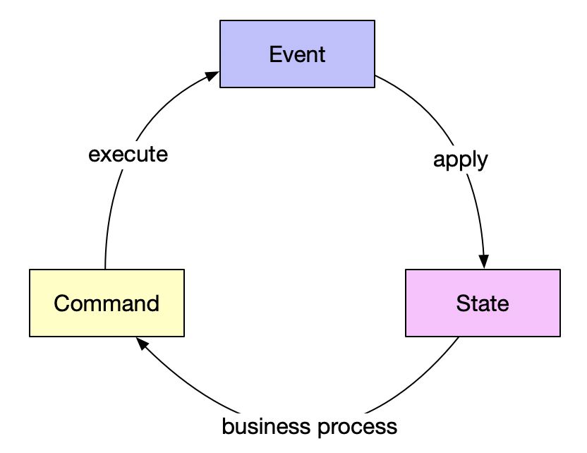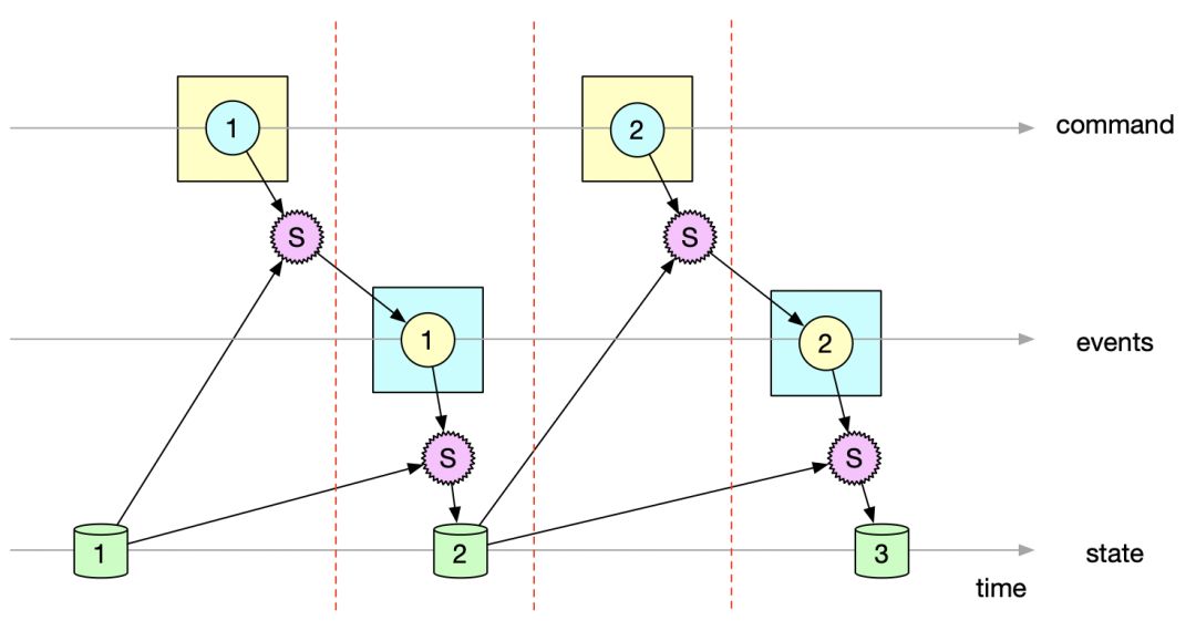 所有外部请求会先被发送给状态机。状态机会结合当前状态生成事件。事件被存入事件仓库(Event Store)后会被状态机执行,进而改变状态机内的状态。如图4.4所示:
