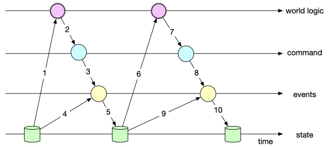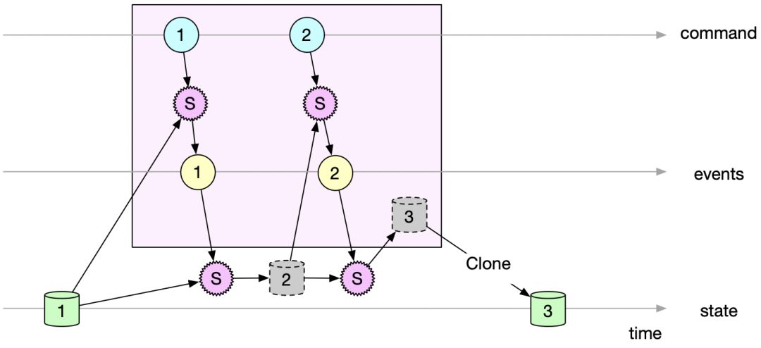 注意,状态机对于同一个命令可能生成不同的事件,完全取决于当前状态。还是刚才的例子,如果此时甲余额只有50美金,转账100美金的命令将无法被成功执行,此时状态机会生成一个转账失败事件。
