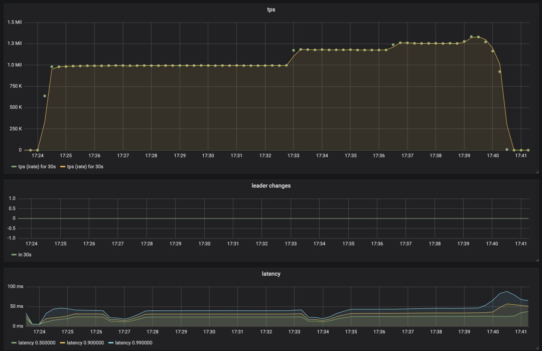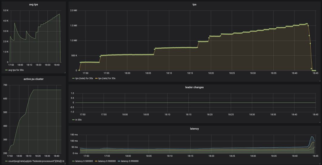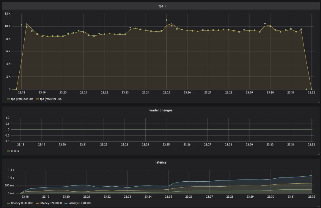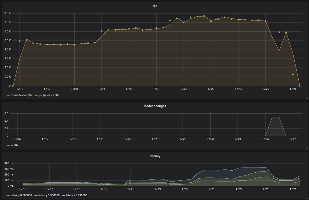 从图中可以看出,在这两种情况下,系统均能从容稳定应对,虽然其中部分节点出现了换主(图3.5),但对总体流量的影响微乎其微。测试过程中甚至还发现延时有短暂下降,这主要是由于批处理阶段打包效率提升。