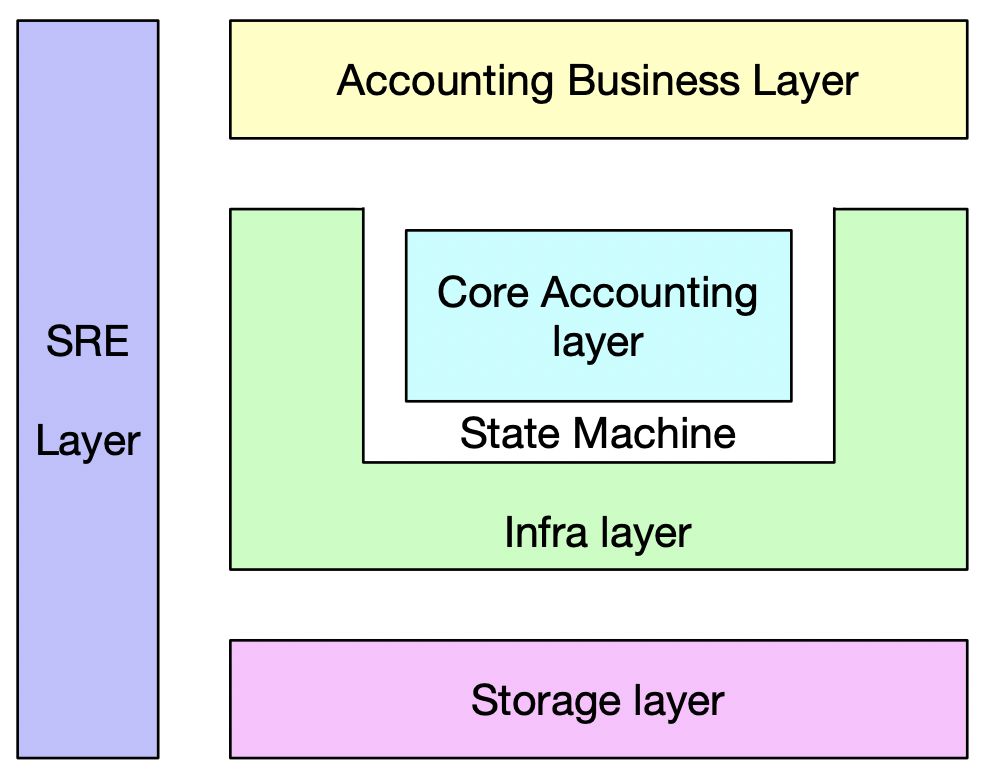 最上层的账务业务层提供外部访问接口,负责处理最上层的业务逻辑,有一定的对外I/O请求,内部无状态。业务会被分解为多个条件转账请求发给下层的基础账务层。基础账务层负责记账,对外无I/O请求,内部有状态。该状态由基础架构层提供的状态机来维护。基础架构层负责提供一个基于Raft算法的高效稳定的状态机实现,其性能由单线程保证,稳定性由强一致性算法来保证。基础账务层处理完的结果为会计账本,会输出给存储层。完整的分层架构图如下图4.3所示: