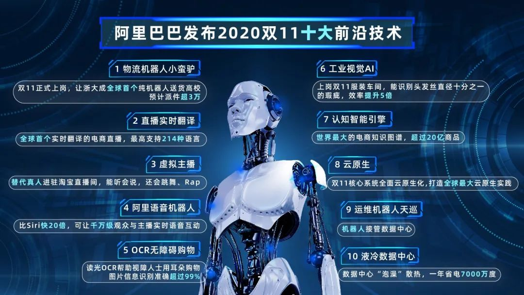 2020双11是史上最具科技含量的一届双11。大规模运用于2020双11的十大前沿技术中,包括正式上岗的物流机器人小蛮驴、支持214种语言的直播实时翻译、一年省电7000万度的液冷数据中心、全面云原生化的阿里核心系统…既有基于数字技术的原生商业创新,也有引领时代的基础技术突破。