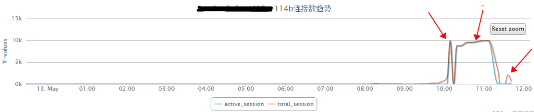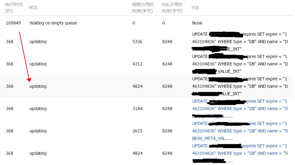 从上图中看到该数据库的活跃连接数最高的时候到达了1W,通过show processlist可以看到大量的并发更新