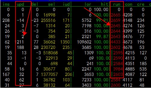 可以看到数据库中的活跃连接数非常高,每秒的update非常不稳定。