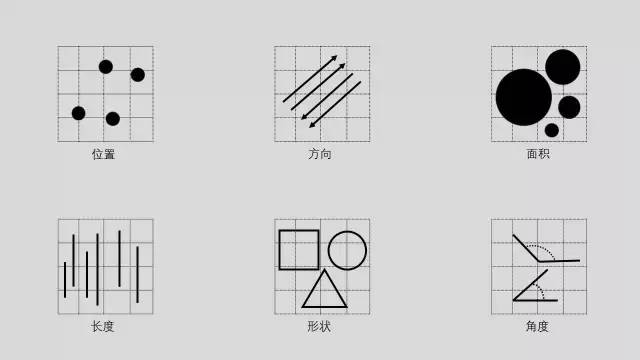明确了我们要借助图表传递什么信息以后我们就可以着手选择合适的图表了,这里我们借助于《数据之美》作者提出的观点,不是列举什么柱状图、折线图等具体的图表,而是介绍一些组成这些图表的零部件。比如说柱状图就是有长度和直角坐标系组成的。我们只需要选择所需的零部件进行组合即可。接下来具体看一下这些零部件。