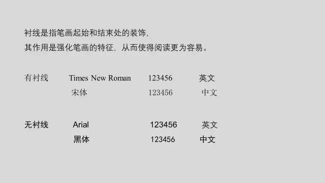 中文常见的衬线和非衬线的两种字体分别是宋体和黑体,而英文对应的是Times New Roman和Arial。