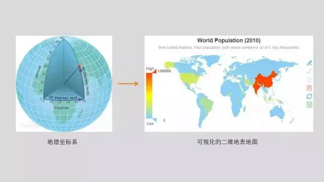 地理坐标系是使用三维球面来定义地球表面位置,以实现通过经纬度对地球表面点位引用的坐标系。但是我们在进行数据可视化的时候一般用投影的方法把其从三维数据转化成二维的平面图形。