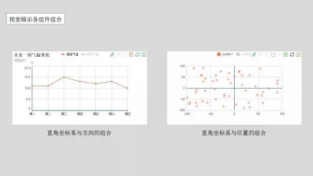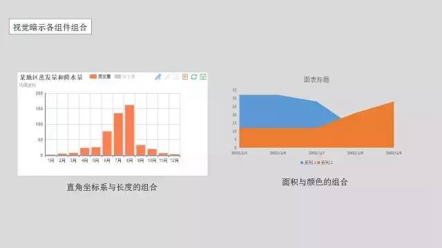 是指通过查看图表就可以与潜意识中的意识进行联系从而得出图表表达的意识。常用的视觉暗示主要有:位置(位置高低)、长度(长短)、角度(大小)、方向(方向上升还是下降)、形状(不同形状代表不同分类)、面积(面积大小)、体积(体积大小)、饱和度(色调的强度,就是颜色的深浅)、色调(不同颜色)。