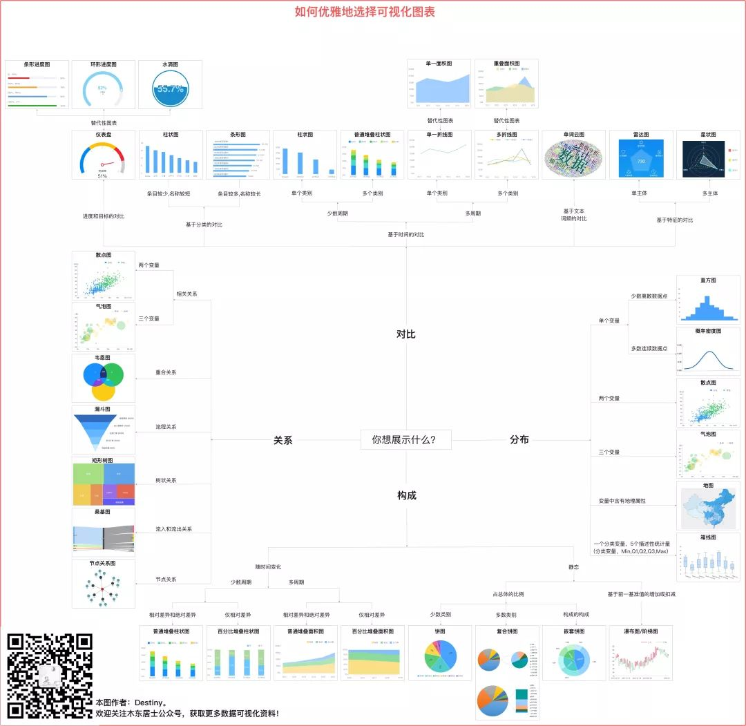 为了让大家对【根据数据关系进行图表选择】有更加直观的了解,指引篇对【数据图表的选择】部分的3篇文章进行了归纳和总结,最终输出了如下的【图表选择决策树】: